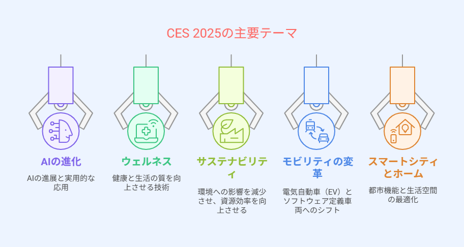 長年CESを定点観測していると、その年ごとのトレンドや注力分野の変化が見えてきます。今年のCES 2025で特に注目を集めたテーマは、以下の通りです。