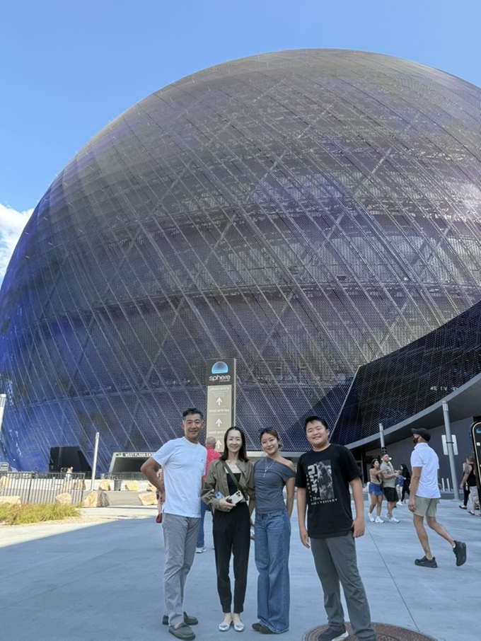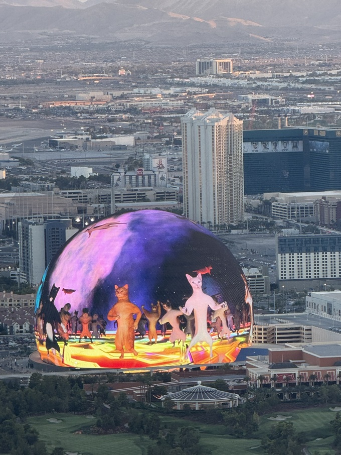 今回の旅行で絶対に外せなかったのが、2023年にオープンした巨大球体型アリーナ「スフィア(Sphere)」です。外から見ても巨大な地球やバスケットボールのように見えるこの建物、中に入るとさらに度肝を抜かれます。