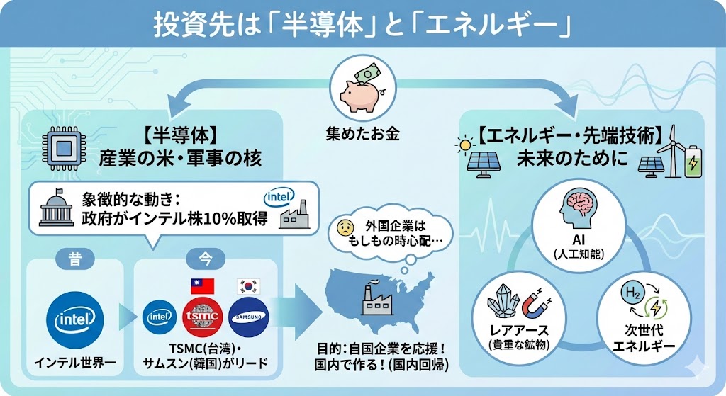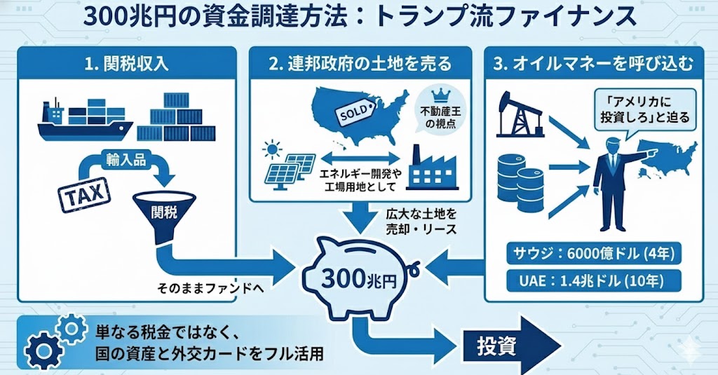 今回は、その「お金の集め方(調達)」と「使い道(投資先)」について深掘りします。トランプ大統領の不動産王らしい発想と、なりふり構わないハイテク覇権への執念が見えるはずです。